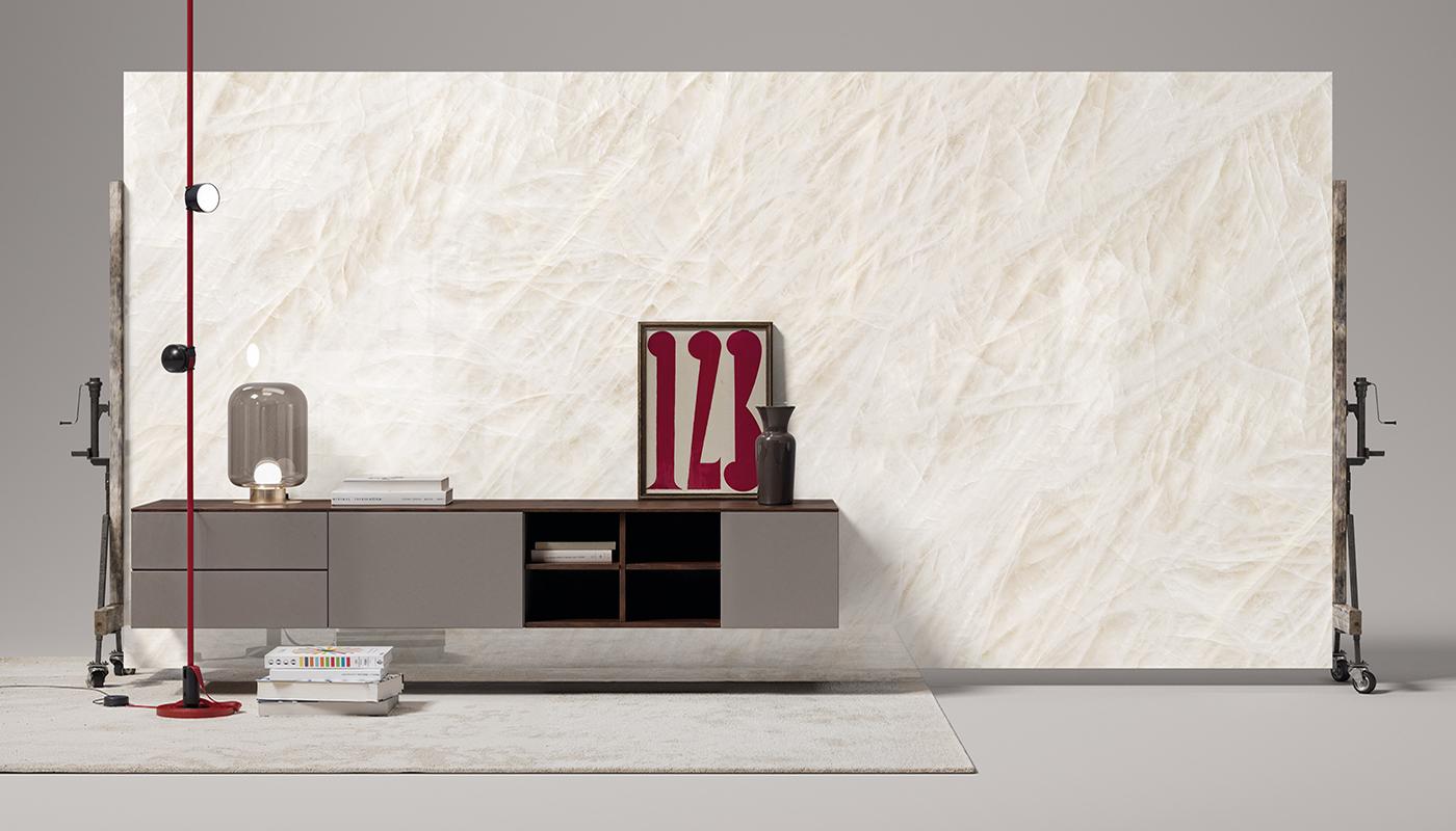 Dalles céramiques en format 160x320 rectifié, en épaisseur 6,5mm, et en format 162x324 non rectifié, en épaisseur 12mm, pour réaliser des objets comme des plans de travail/toilette et des dosserets dans la cuisine et la salle de bains, des tables, des portes, des revêtements de sol et mur unifiés, y compris à l'extérieur, avec des détails, une souplesse d'emploi et une personnalisation impensables jusqu'à présent.