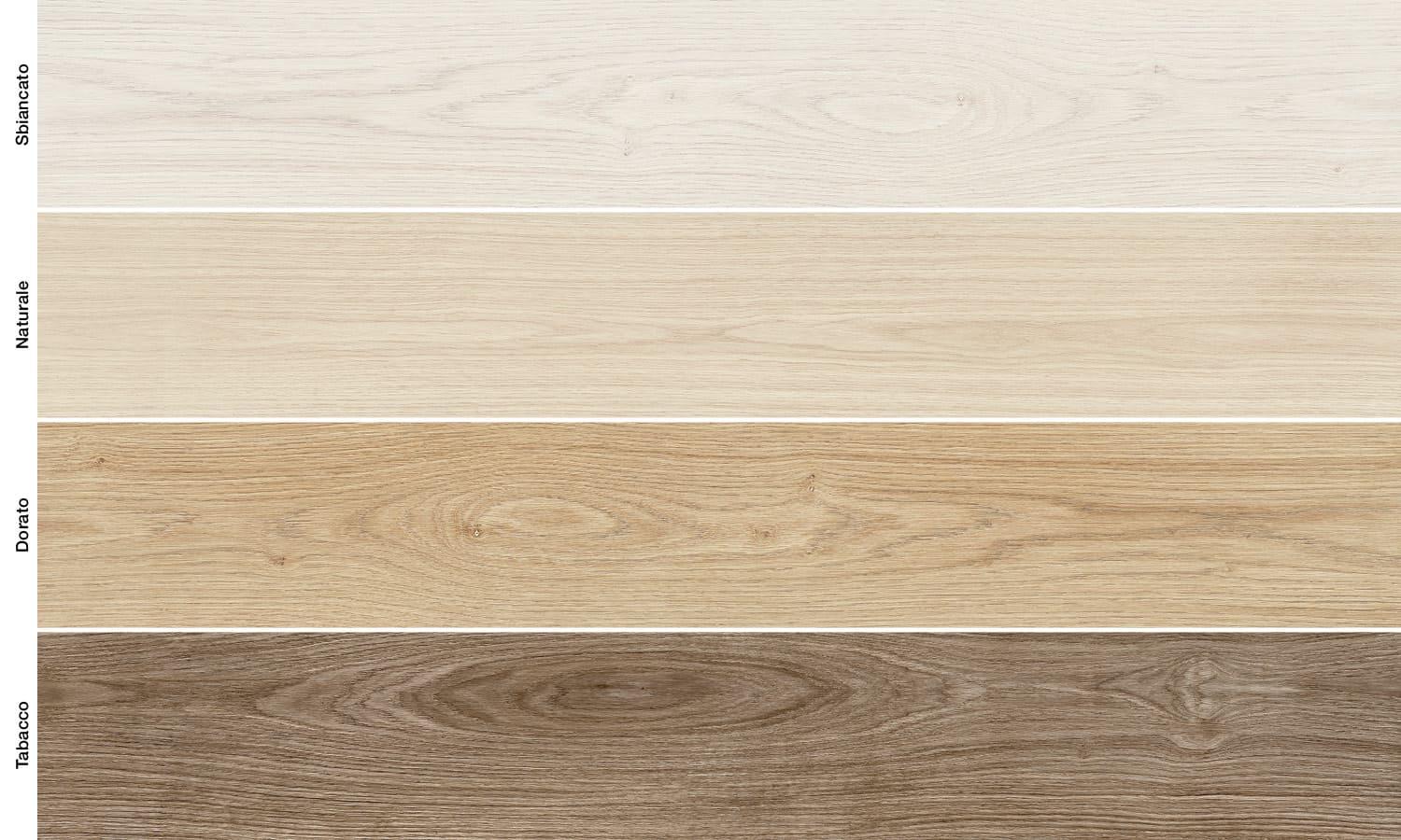 La collection au format 20x120 cm est déclinée en quatre teintes : Sbiancato, Naturale, Dorato et Tabacco.