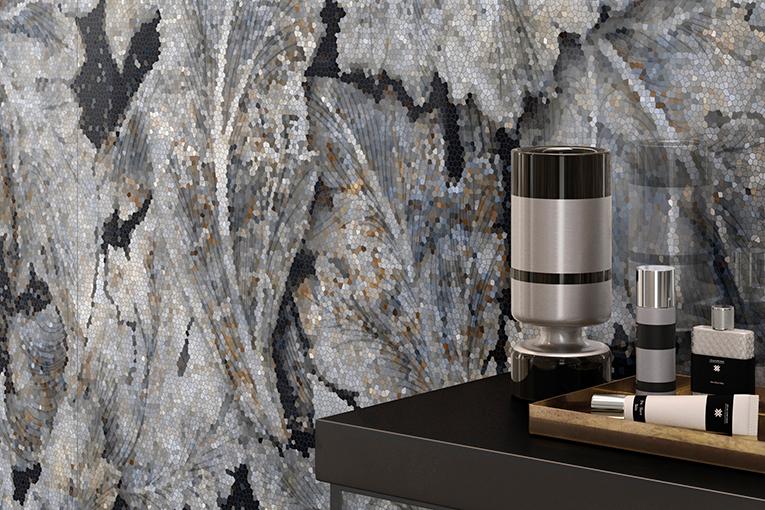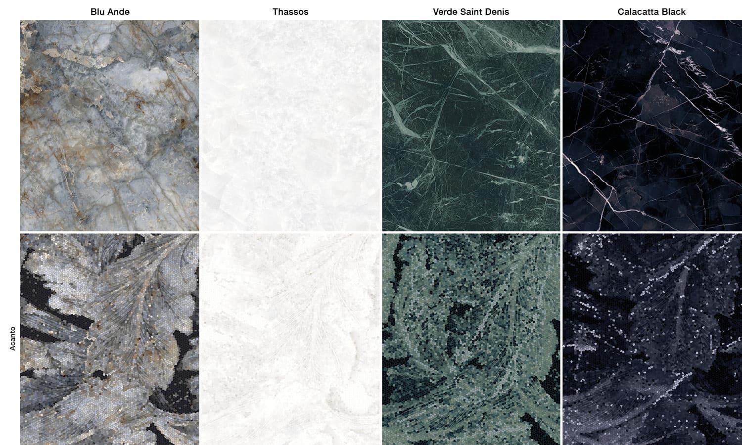 La collection propose des nouvelles couleurs et des assortiments inédits pour en exalter l'expressivité: Thassos, Calacatta Black, Verde Saint Denis, Blu Ande. Quatre nouvelles propositions de marbres naturels et rodés trouvent leur expression maximale dans les grandes dalles. En travaillant sur de nouvelles couleurs et de nouveaux motifs, le projet Tele di Marmo Revolution poursuit l’exercice de relecture du marbre selon une clé contemporaine en ajoutant à la gamme le dessin Acanto. L'écho de la mosaïque artistique s'exprime par des géométries précises et extrêmement calibrées, au niveau des tonalités comme des détails. Cette décoration, à forte valeur expressive, fait du projet Tele di Marmo Revolution une proposition de revêtement complète où veines, reflets et détails acquièrent une personnalité capable de laisser une marque dans chaque projet, unique et originale comme une œuvre d’art. Des décors de mosaïques enrichissent davantage la collection et multiplient les possibilités de pose.