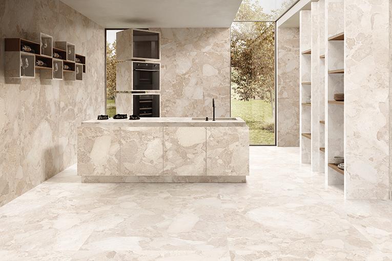 Full Lappato présente un graphisme spécifique qui interprète la pierre d'origine une fois polie, parée d'un éclat élégant. Dans la finition Naturale, la grande richesse de détails de la matière est due, notamment, à la technologie exclusive Digitouch combinée à une structure fine et délicate, synchronisée avec les éléments graphiques de base. Dans la finition Silktech, la douceur typique et le toucher soyeux qui la singularisent viennent s'ajouter aux caractéristiques de la version Naturale. La texture dynamique qui joue sur la diversité des nuances de l'effet pierre du décor Ritmo apporte tridimensionnalité et mouvement aux espaces.