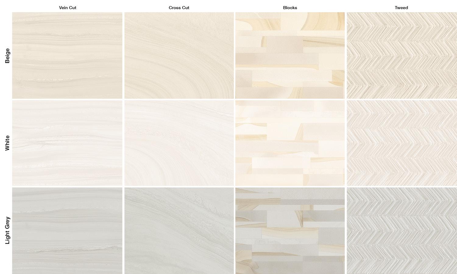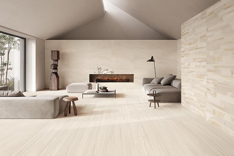 L’étude et le riche échantillonnage de la pierre d’origine nous ont permis de choisir un motif graphique de composition dans lequel les différentes sédimentations apparaissent fluides et équilibrées. Le dialogue entre les deux versions de Varana Stone, Vein Cut et Cross Cut, ainsi que les deux décors distinctifs, offrent aux architectes d’intérieur un outil précieux pour créer des espaces extrêmement naturels et élégants, même à grande échelle. Varana Stone présente la nouvelle finition Soft Honed. La matière céramique offre un toucher doux, lisse et mat. Ce résultat, obtenu par un brossage mécanique au terme du processus de production, garantit par ailleurs d’excellentes caractéristiques techniques de résistance au glissement.