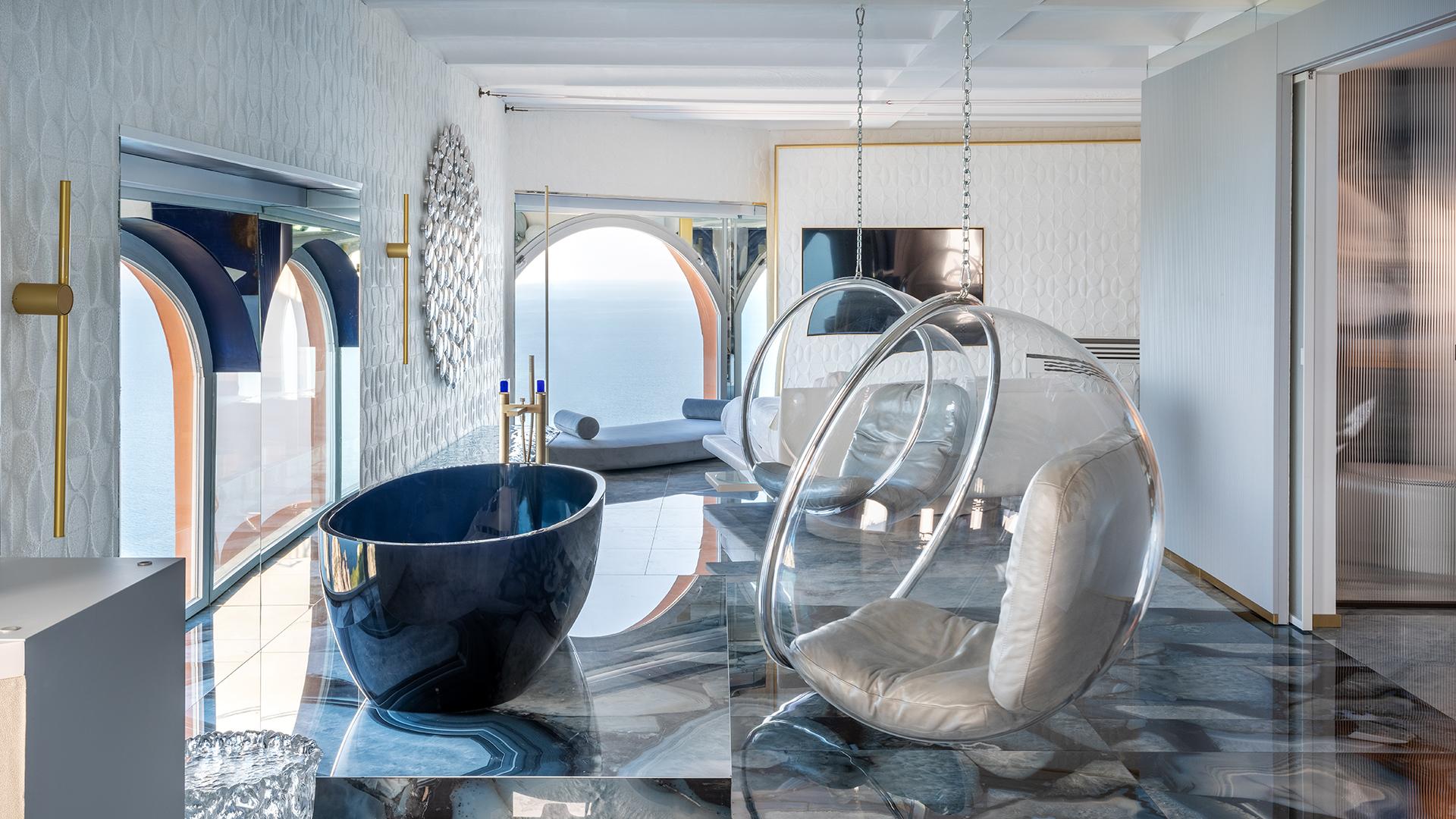 La collection Tele di Marmo Precious y a été utilisée en raison de sa combinaison inédite de cristaux et d'agates qui a permis de recréer la beauté de l'atmosphère maritime.