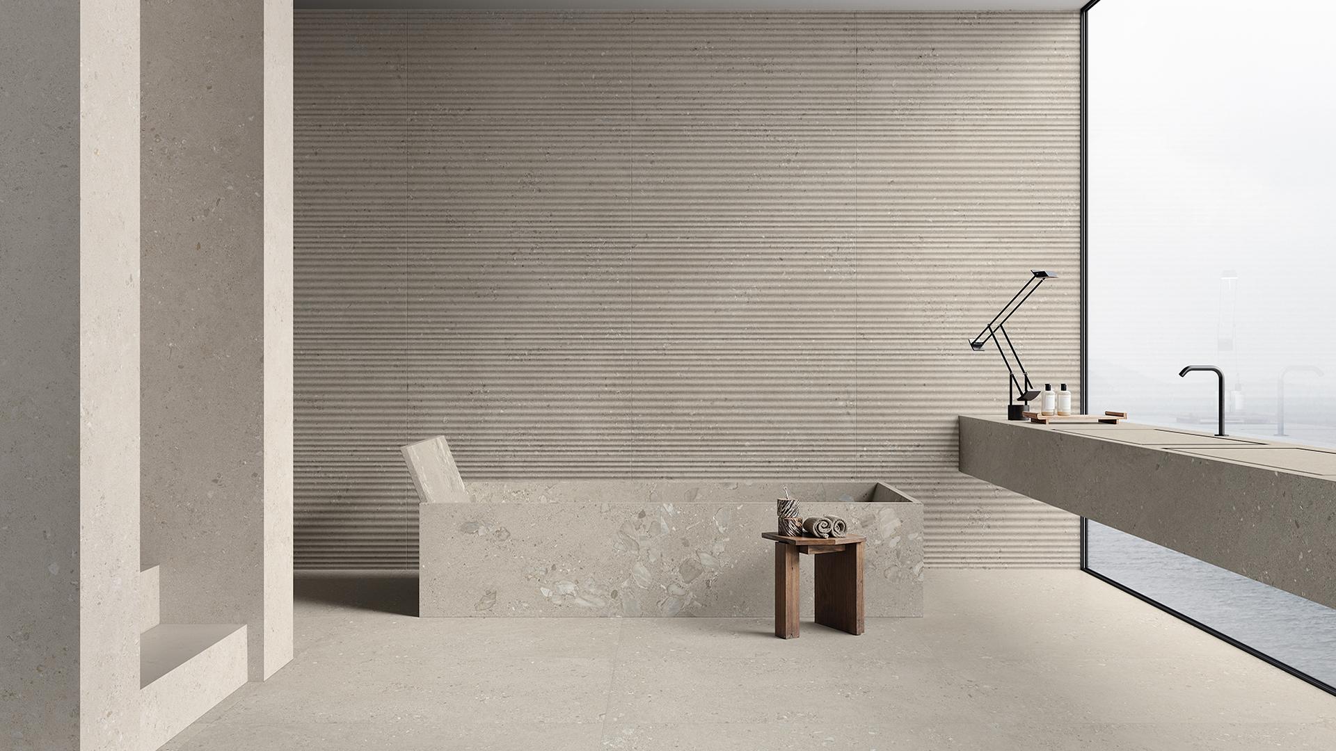 Pour une tridimensionnalité plus fluide, GemmaStone constitue une solution idéale. Inspirée d'une pierre sédimentaire marine, cette collection intègre des fragments naturels dans une esthétique sophistiquée. Le décor Onde introduit un mouvement dynamique et continu, offrant un rendu élégant et maîtrisé, sans effet décoratif excessif.
