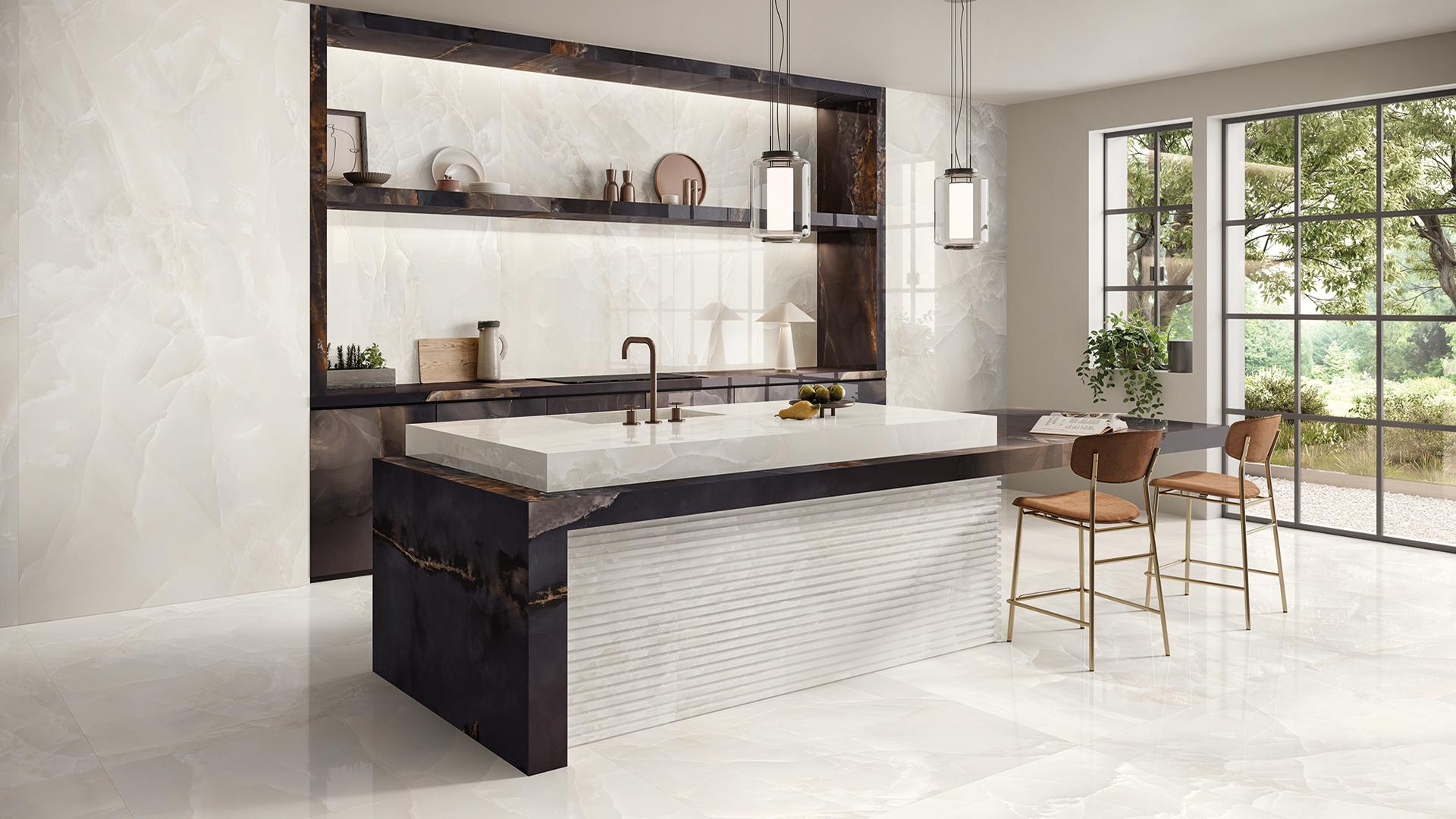 Outre sa fonction de protection contre les projections, la crédence de cuisine assure le lien visuel unissant les équipements, l'électroménager, le plan de travail et les meubles de la cuisine. En choisissant ces carreaux particuliers (et stratégiques), il est bon de garder à l'esprit leur association avec les autres éléments de la cuisine, un espace où il est permis d’expérimenter un peu plus que dans les autres pièces, d’apporter un brin d'éclectisme, une dérogation au principe de continuité qui guide les choix esthétiques des surfaces. Le marbre s'avère souvent la solution gagnante pour relier la crédence à la décoration de la cuisine, sans jamais être banal ou dissonant. La cuisine est le terrain de jeu idéal pour lier l'attrait intemporel du marbre aux goûts et aux perceptions d'une décoration contemporaine. Tele di Marmo Onyx by Emilceramica est un excellent point de départ pour concrétiser cette nouvelle façon d'appréhender le marbre. Fruit d'une recherche minutieuse sur les jaspures des marbres les plus prisés au monde, aux couleurs emblématiques et vibrantes, la collection ouvre des perspectives inédites sur l'un des matériaux les plus fascinants qui soient. Le tribut aux perceptions ancestrales de l'onyx donne une nouvelle vie au carreau qui devient œuvre d'art : l'opulence des facettes éclatantes, la tridimensionnalité, les jeux de clair-obscur se déclinent en cinq variantes chromatiques raffinées. Le marbre élargi ses possibilités à de nouvelles surfaces qui allient le charme impérissable à une décoration contemporaine plus recherchée.
