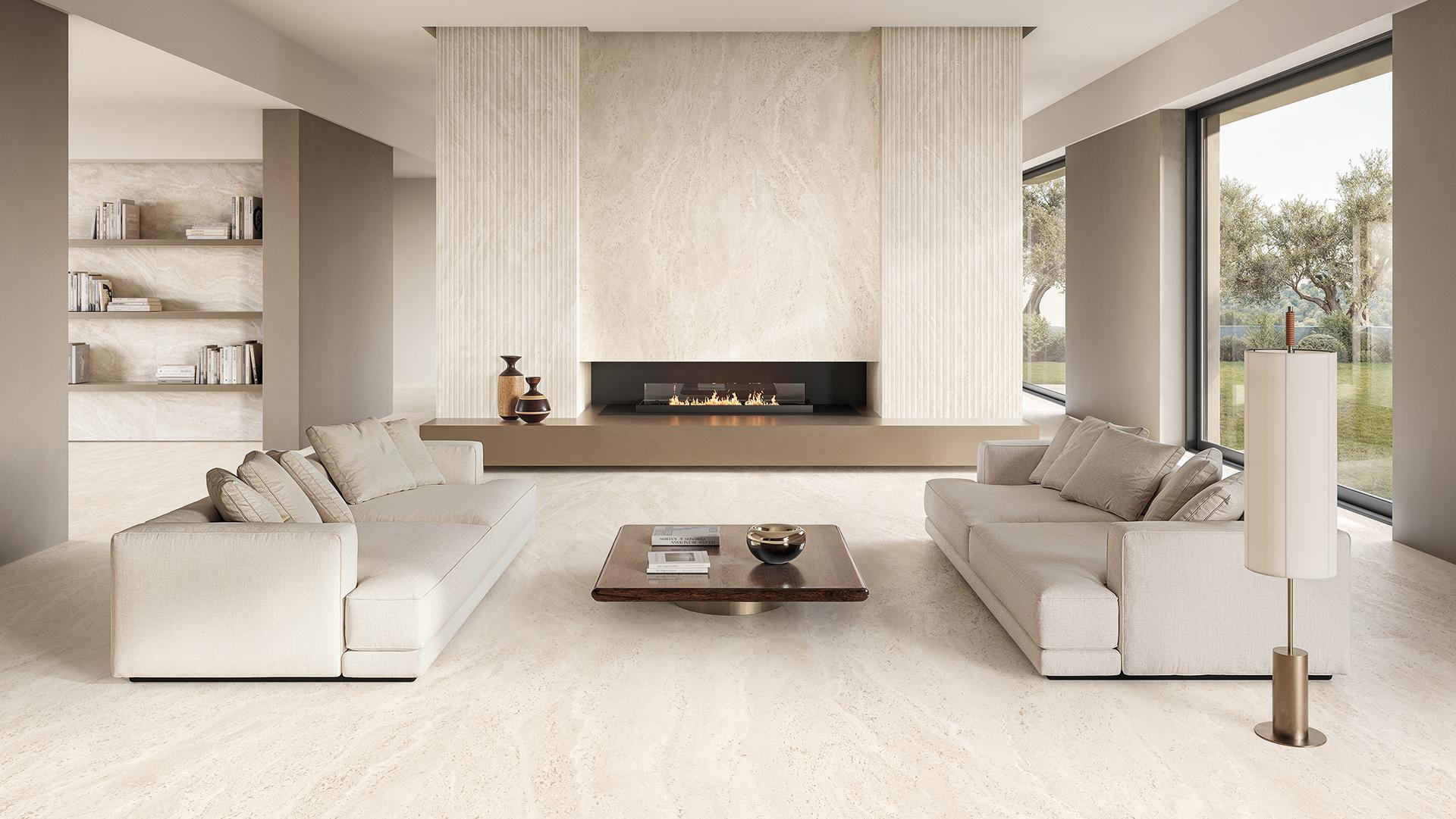 Dans les intérieurs modernes, la cheminée apporte du caractère à la pièce sans l'alourdir. L'utilisation d'un même matériau sur plusieurs surfaces – cheminée, murs et sols – crée un dialogue visuel cohérent. Par exemple, coordonner le revêtement avec les sols en grès renforce le résultat final. La collection Dual Travertine by Emilceramica, avec sa coupe à contre-passe, se prête particulièrement bien à ce type d'intégration. Elle peut habiller à la fois le foyer et un mur d'accent, garantissant une continuité visuelle harmonieuse qui amplifie la perception de l'espace.