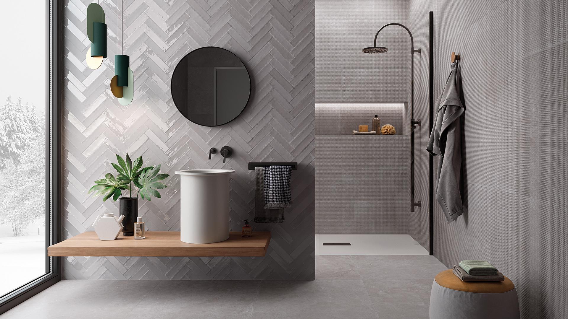 Les murs de douche stimulent la conception, permettant de redonner vie au pouvoir créatif du ciment. Sur le sol et murs de la douche, on peut choisir un carrelage en grès d'une couleur différente, jouer avec les contrastes de couleurs et expérimenter différentes finitions - la syntonie avec la vitre de la douche, qui peut offrir des contrastes de matière intéressants en termes de luminosité et de reflets, est un aspect à prendre en compte.