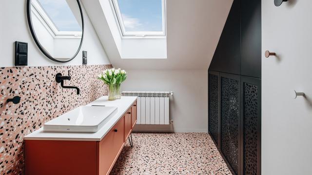 Quant aux salles de bains, elles ont été mises en valeur par la collection Tele di Marmo Revolution by Emilceramica. Dans la première, la teinte Verde Saint Denis, placée derrière le miroir, ajoute profondeur et caractère à l'espace. Dans la seconde, la collection Calacatta Black posée sur les murs de la douche crée un élégant contraste d'ombre et de lumière.