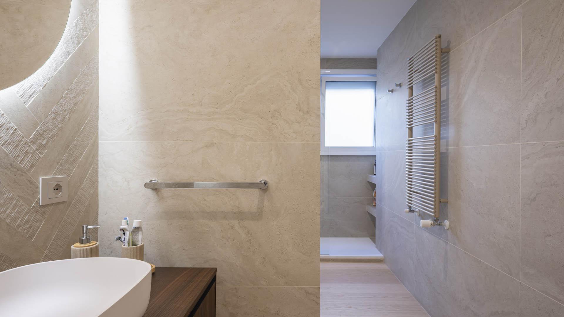 La collection Unique Travertine a également été utilisée dans une disposition en bâtons rompus, au format 7,5x60 cm, en alternant les finitions Minimal et Ruled, toutes deux dans les nuances Cream. Ce jeu de textures crée un mouvement visuel raffiné, sublimé par un grand miroir rétroéclairé qui amplifie la luminosité et la profondeur de la pièce.