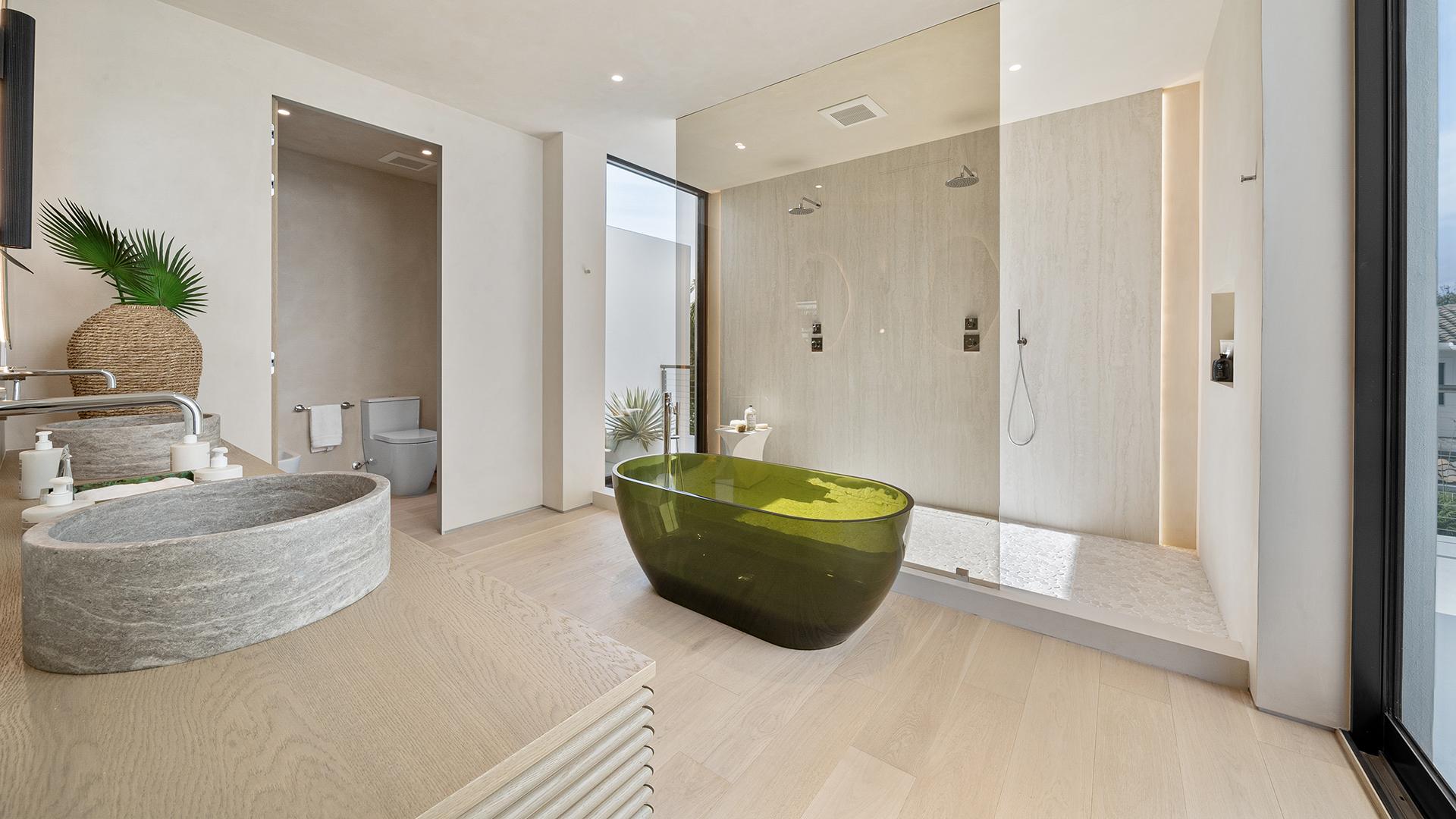 Un élément essentiel de ce projet a été le choix des matériaux. En particulier, les architectes ont sélectionné les produits en grès cérame Emilgroup pour habiller les 5 salles de bains de la villa. Les dalles Level Onyx Green, qui font penser aux colorations d'eaux cristallines, ont été posées dans la « powder room ». La collection Mapierre, en nuance Blanc, a donné corps à une salle de bains raffinée et neutre, avec ses finitions Noble et Ligne différenciant la destination des lieux. Les différentes finitions de la collection Landscape ont été choisies pour 2 des 5 salles de bains de la villa, dans les couleurs Avorio et Cenere, et ont suscité dans les espaces une sensation de naturel et d'équilibre, fondamentale pour un projet de ce genre. Les dalles de Travertino Vein White de Level Stone, qui reproduisent les typiques veines longitudinales de la coupe à passe, ajoutent une touche de luxe et de raffinement, en perfectionnant le look de chaque salle de bains avec style et classe.