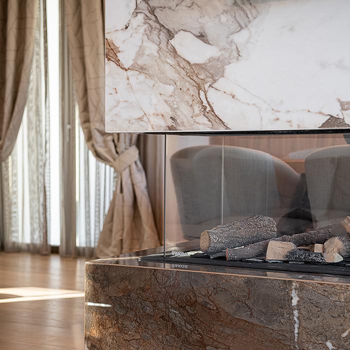 Pour autant, la star incontestée de l'espace est l'imposante cheminée qui trône au centre du salon. Pour l’inscrire dans la continuité des pièces, sa partie supérieure a été revêtue de dalles Level dans la teinte Macchia Vecchia, tandis que la collection Tele di Marmo Reloaded dans la teinte Fossil Brown Malevic a été utilisée pour le revêtement de la partie inférieure.
