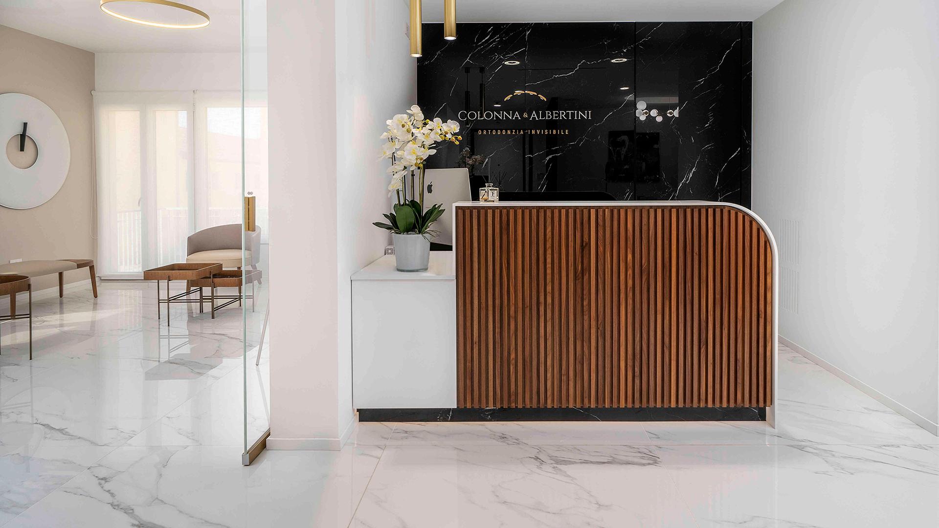 À l'entrée, le mur de fond réalisé avec 3 dalles en coloration Nero Marquinia, dessine une toile de fond qui met en valeur la forme de la réception et le logo du cabinet dentaire, tout en dissimulant la porte revêtue de la même dalle.